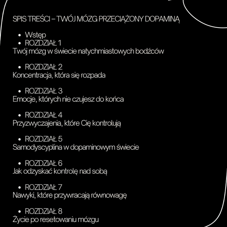W spisie treści znajdziesz przejrzysty podział wszystkich rozdziałów oraz tematów poruszanych w ebooku. Dzięki temu szybko odnajdziesz interesujące Cię zagadnienia 🔍, sprawdzisz układ materiałów 📂 i zorientujesz się, czego możesz spodziewać się w kolejnych częściach. To praktyczny przewodnik, który ułatwi Ci poruszanie się po ebooku 🚀 i pomoże w pełni wykorzystać jego treść.